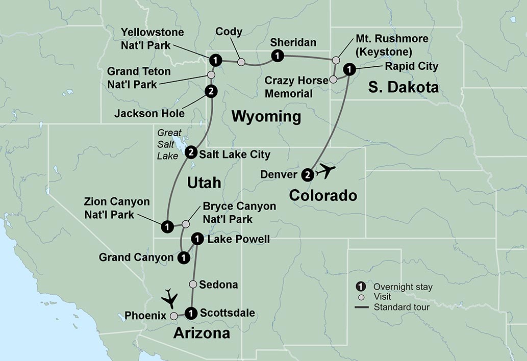 Experience the grandeur of the American West as you explore six fantastic National Parks on this exciting journey. Relish overnight stays in a lodge nestled in the heart of Yellowstone and in a National Historic Landmark inside the Grand Canyon. Enjoy a breakfast cruise on Lake Powell. Marvel at the magnitude and color of Zion’s cliffs. Enjoy 2-night stays in Salt Lake City and Jackson Hole. Drive through the incredible Bighorn Mountains and the great Sioux Nations Territory before seeing Mt. Rushmore and Crazy Horse Monument. Complete your adventure with a stay in Denver and a visit to Rocky Mountain National Park. Meet a local Lakota Native American at dinner and learn about their fascinating way of life, past and present.